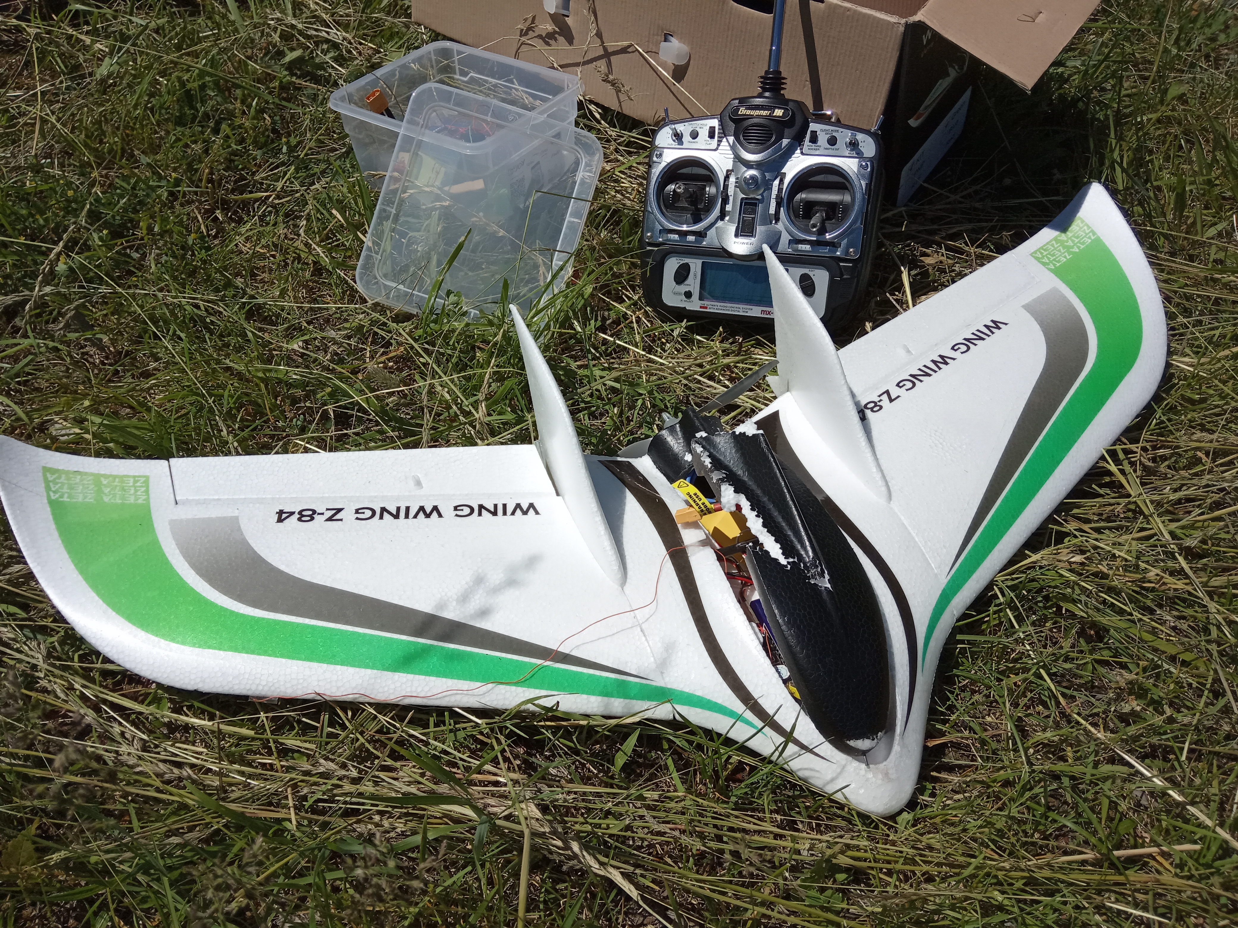 In general, I can recommend the kit even for beginners. At close to zero wind it can be made fairly slow and it’s easy to control. I think the “Toro 900” was still slightly more forgiving but I definitely don’t regret having bought the Wing Wing Z-84. My detachable wings fulfill their purpose of being easy to transport. The only issue I had so far was with the mount of the canopy. The standard plastic lock didn’t fit onto my carbon tube as it’s diameter is of course larger than the 4mm of the original rod. Instead I glued in a magnet and a piece of metal to hold the canopy. Unfortunately that didn’t turn out to well. During one flight the canopy came off and got slightly shredded by the motor. Now it looks well used and has a new locking mechanism based on a pin that slides into the main body an holds everything place. Except for this small accident nothing else happened so far.